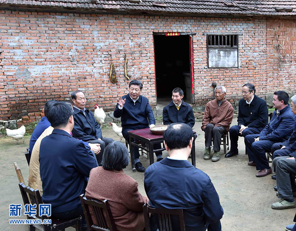 2016年4月24日至27日,中共中央總書記、國家主席、中央軍委主席習近平在安徽調研。這是4月24日下午,習近平在六安市金寨縣花石鄉大灣村村民陳澤申家同村民們親切交流。 新華社記者 李濤 攝
