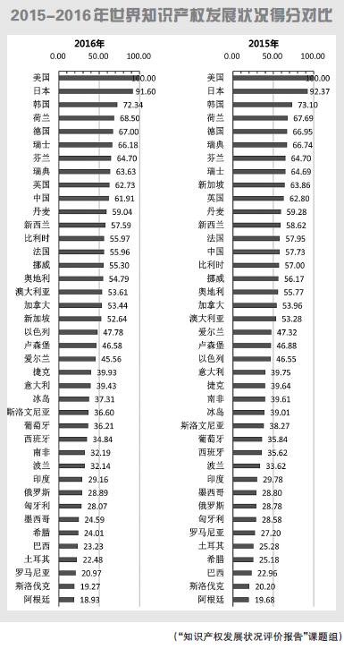 《報告》比較了包括經濟合作組織(OECD)的34個國家、金磚5國和新加坡在內的40個國家的知識產權發展狀況。其中顯示,2016年我國知識產權發展水平世界排位由第14位上升至第10位。較之2015年,我國的知識產權發展狀況總指數得分從57.73提升至61.91,與知識產權強國的差距進一步縮小。另一方面,我國知識產權發展狀況世界排名提升迅速。從2012年到2016年的5年時間內,美國、日本、韓國等三國得分穩居前3位,我國排名在2012年至2016年4年間從第19位提升至第10位,平均每年提升3個位次,知識產權發展的總體水平,尤其是知識產權的保護運用水平快速提升。