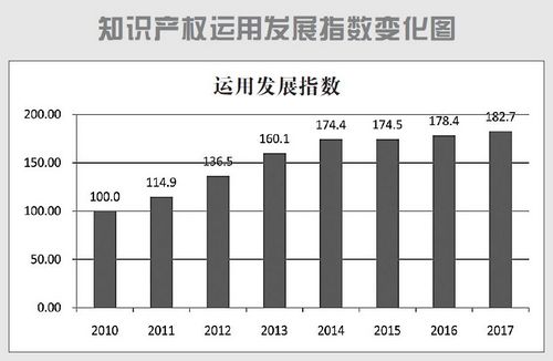 2017年運用指數為182.7,比上年提高4.4個點。知識產權運用發展指數由2010年的100穩步上升至2017年的182.7,但2013年后增速有所放緩。反映知識產權運用的指標有升有降,整體上呈現出平穩上漲趨勢。