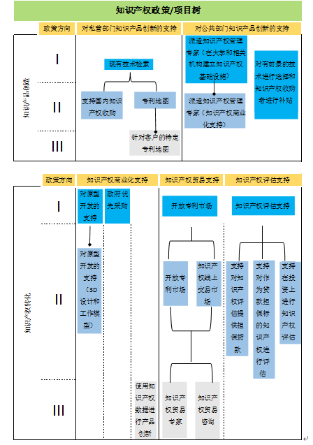 雖然事實證明,就對中小企業的直接支持而言,知識產權轉化的政策和項目的需求更為旺盛,但引進知識產品創新政策和項目仍是基礎。許多缺少知識產權基礎設施的成員能夠確以實施有高需求的項目I和II階段,[9]但要上述成員能夠準備和實施樹狀圖中項目的II-III階段,應增加先決條件(為了完成專利地圖而建立專利數據庫等),因而相關成員的準備工作應該提前3-5年進行。此外,成員應當在指南的引導下在經濟方面能自主地檢查其知識產權基礎,并實施與知識產權基礎設施相匹配的項目。結果用以下樹狀圖表示。