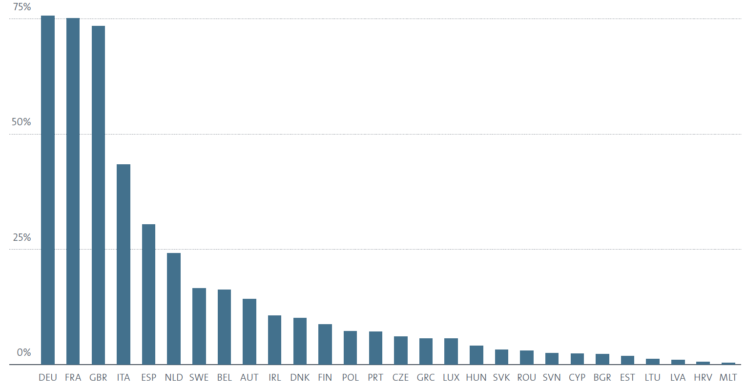 報告統(tǒng)計了近十年間歐洲授權(quán)專利進(jìn)入指定國的情況。報告認(rèn)為,歐盟各國不同的專利法規(guī)導(dǎo)致專利權(quán)人進(jìn)入指定國的積極性差異極大,進(jìn)入德國、法國、和英國的專利最多,十年間進(jìn)入率約為75%,而進(jìn)入中部和東部歐洲國家的專利進(jìn)入率則遠(yuǎn)低于10%。報告認(rèn)為,統(tǒng)一專利制度的實施在降低專利申請成本的同時擴(kuò)大了保護(hù)范圍,并且,隨著統(tǒng)一專利法院的建立,專利權(quán)人用于統(tǒng)一專利訴訟的費用甚至可能低于傳統(tǒng)歐洲專利在單個國家的訴訟費用。