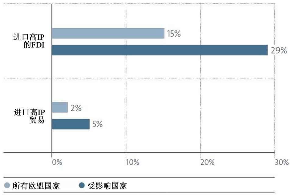 與其他行業(yè)相比較,歐洲單一市場中分析儀器、生物制藥、化學(xué)品、信息和通信技術(shù)、醫(yī)療器械和生產(chǎn)技術(shù)等高IP行業(yè)在歐盟的出口貿(mào)易和外國直接投資(FDI)中所占的比重,要大于其在進(jìn)口貿(mào)易、區(qū)域內(nèi)貿(mào)易、以及成員國之間相互投資中所占的比重。同時,高IP行業(yè)的貿(mào)易和外國直接投資(FDI)量對于歐盟各國的專利保護(hù)程度尤其敏感。