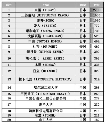 圖 1 碳纖維全球?qū)@暾?qǐng)量前20申請(qǐng)人