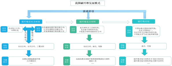 根據(jù)對(duì)國內(nèi)碳纖維產(chǎn)業(yè)鏈重點(diǎn)企業(yè)及高校的調(diào)研分析,我國碳纖維產(chǎn)業(yè)發(fā)展模式存在以下問題: