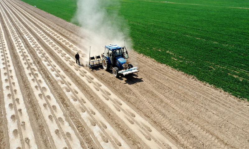 在新疆生產(chǎn)建設(shè)兵團(tuán)第六師共青團(tuán)農(nóng)場(chǎng),一臺(tái)安裝北斗導(dǎo)航自動(dòng)駕駛系統(tǒng)的播種機(jī)在播種棉花(2020年4月8日攝,無人機(jī)照片)。新華社發(fā)(李華北 攝)