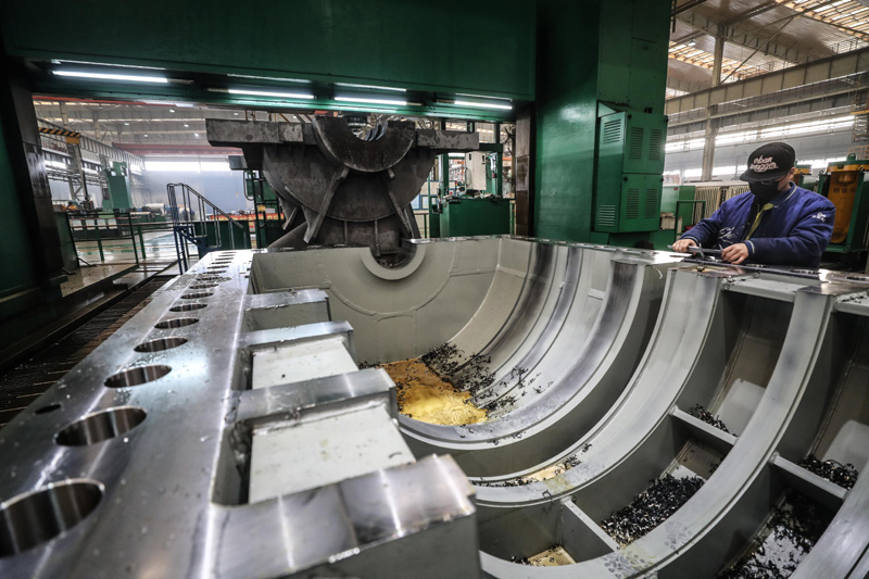 沈陽(yáng)鼓風(fēng)機(jī)集團(tuán)股份有限公司的工人在車間進(jìn)行生產(chǎn)工作(2020年2月10日攝)。新華社記者 潘昱龍 攝