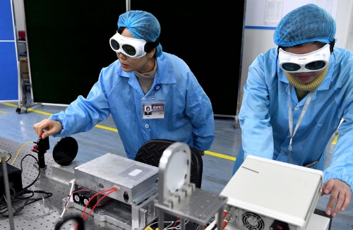 2月25日,在中國(guó)航空工業(yè)集團(tuán)公司洛陽(yáng)電光設(shè)備研究所,航空工業(yè)集團(tuán)光電專業(yè)特級(jí)技術(shù)專家羊毅(左)與團(tuán)隊(duì)成員在實(shí)驗(yàn)室做實(shí)驗(yàn)。新華社記者 李安 攝