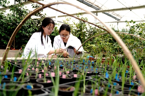 上海植物園科研人員程琳(左)、張蕾蕾在溫室觀察記錄花菖蒲新品種生長(zhǎng)情況(2020年6月5日攝)。新華社記者 張建松 攝