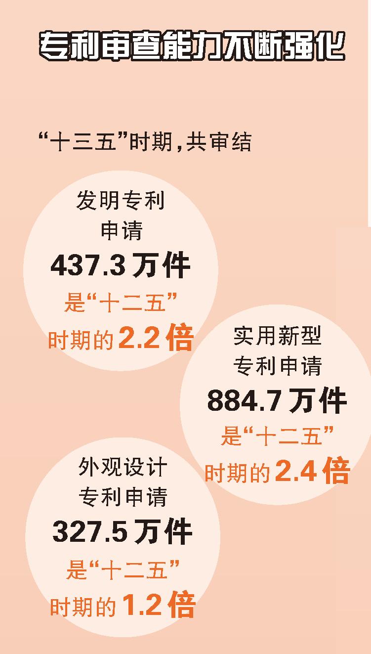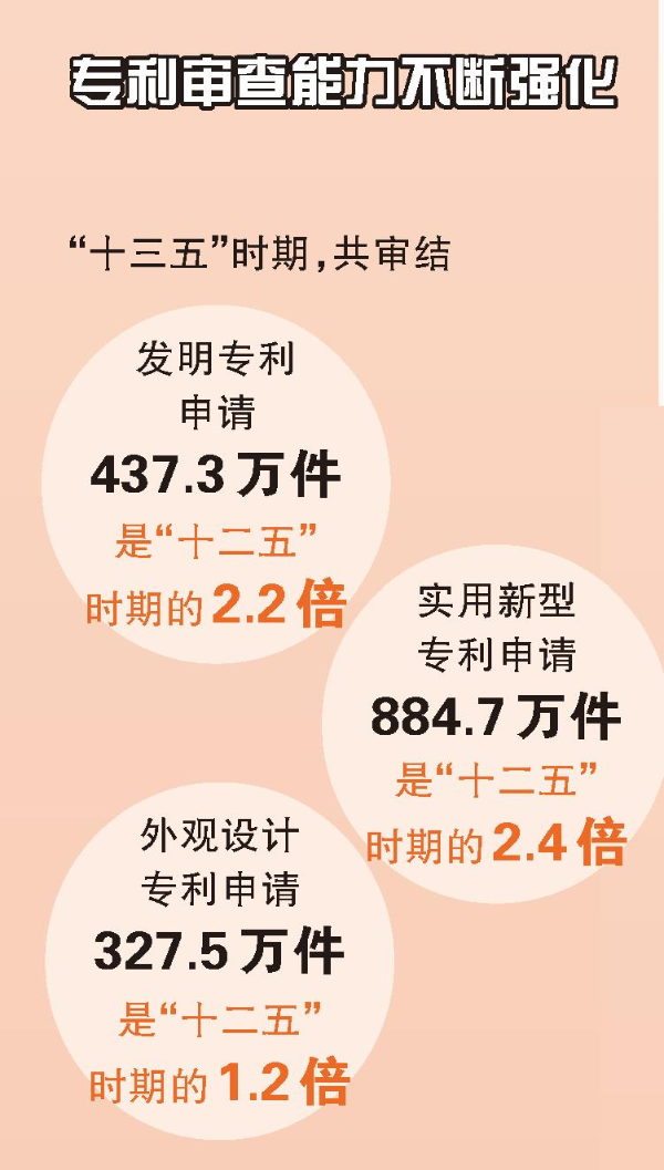 在專利審查方面,“十三五”時(shí)期,共審結(jié)發(fā)明專利申請(qǐng)437.3萬(wàn)件、實(shí)用新型專利申請(qǐng)884.7萬(wàn)件、外觀設(shè)計(jì)專利申請(qǐng)327.5萬(wàn)件,分別是“十二五”時(shí)期的2.2倍、2.4倍、1.2倍,完成PCT國(guó)際專利檢索26萬(wàn)件,是“十二五”時(shí)期的2.4倍。