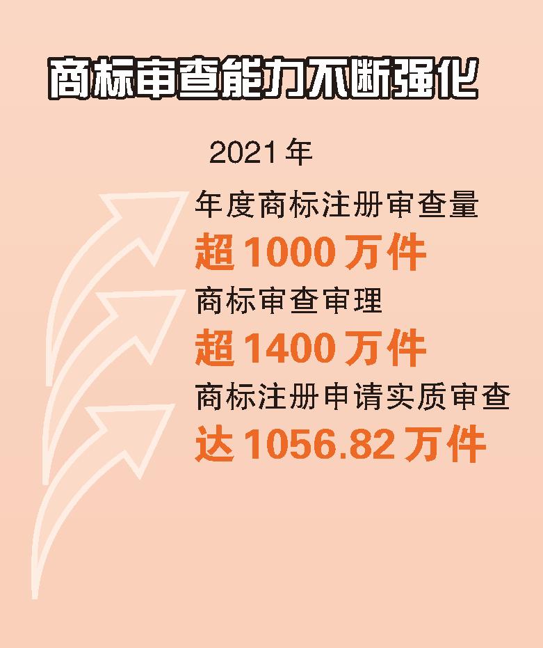 在商標(biāo)審查方面,2021年首次實(shí)現(xiàn)年度商標(biāo)注冊(cè)審查量超1000萬(wàn)件,2200多名商標(biāo)審查員勠力同心,2021年共完成商標(biāo)審查審理超1400萬(wàn)件。其中商標(biāo)注冊(cè)申請(qǐng)實(shí)質(zhì)審查達(dá)1056.82萬(wàn)件,同比增長(zhǎng)20.31%。