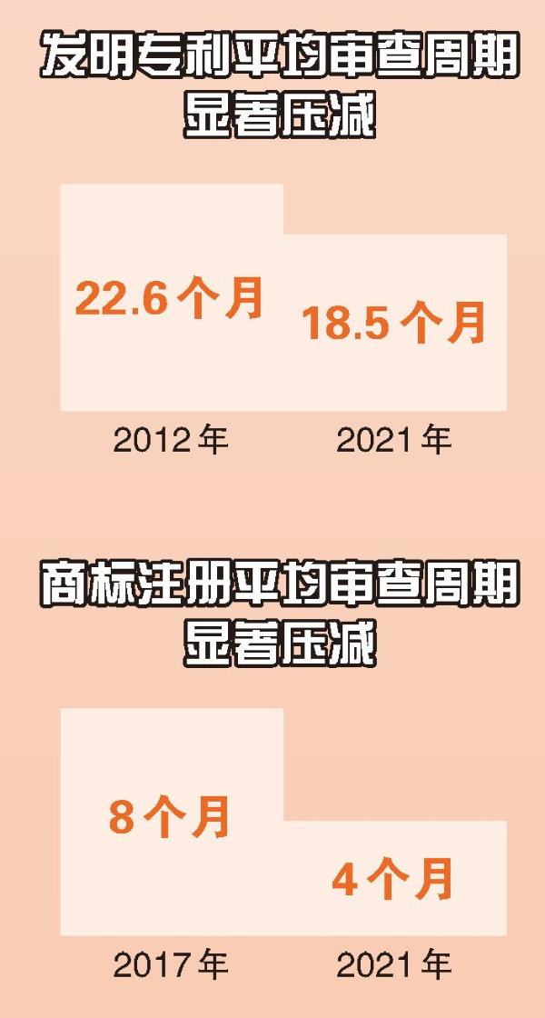 高價(jià)值發(fā)明專利審查周期壓減至13.3個(gè)月,發(fā)明專利平均審查周期壓減至18.5個(gè)月,商標(biāo)注冊(cè)平均審查周期穩(wěn)定在4個(gè)月,一般情形商標(biāo)注冊(cè)周期壓縮到了7個(gè)月……這是2021年我國(guó)知識(shí)產(chǎn)權(quán)審查提質(zhì)增效交出的“成績(jī)單”。