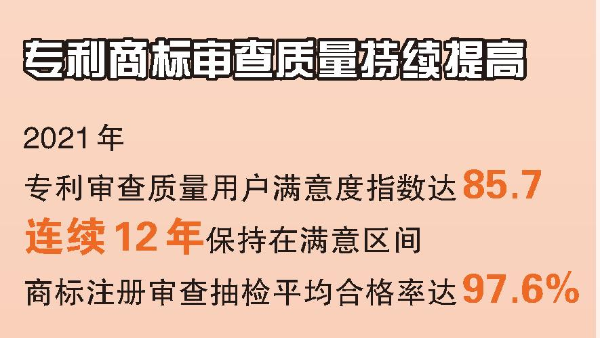 通過(guò)以上舉措,我國(guó)專利商標(biāo)審查質(zhì)量持續(xù)提高,2021年,專利審查質(zhì)量用戶滿意度指數(shù)達(dá)85.7,連續(xù)12年保持在滿意區(qū)間,并且實(shí)現(xiàn)了穩(wěn)中有升。商標(biāo)審查質(zhì)量穩(wěn)步提升,2021年商標(biāo)注冊(cè)審查抽檢平均合格率達(dá)97.6%。