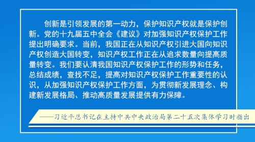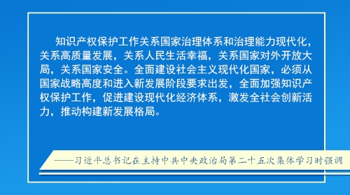 中共中央政治局11月30日下午就加強我國知識產權保護工作舉行第二十五次集體學習。中共中央總書記習近平在主持學習時強調,知識產權保護工作關系國家治理體系和治理能力現代化,關系高質量發展,關系人民生活幸福,關系國家對外開放大局,關系國家安全。全面建設社會主義現代化國家,必須從國家戰略高度和進入新發展階段要求出發,全面加強知識產權保護工作,促進建設現代化經濟體系,激發全社會創新活力,推動構建新發展格局。[查看全文]