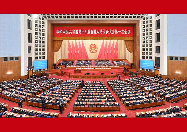 十四屆全國人大一次會議在人民大會堂舉行第五次全體會議,決定國務院副總理、國務委員、各部部長、各委員會主任、中國人民銀行行長、審計長、秘書長的人選,分別表決全國人大民族委員會、監察和司法委員會、教育科學文化衛生委員會、外事委員會、華僑委員會、環境與資源保護委員會、農業與農村委員會、社會建設委員會等專門委員會主任委員、副主任委員、委員人選名單草案
